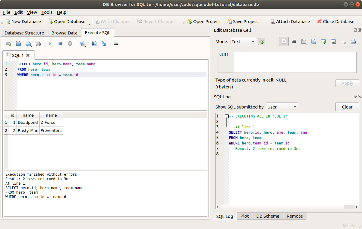 Now let's use SQLModel to do the same select.